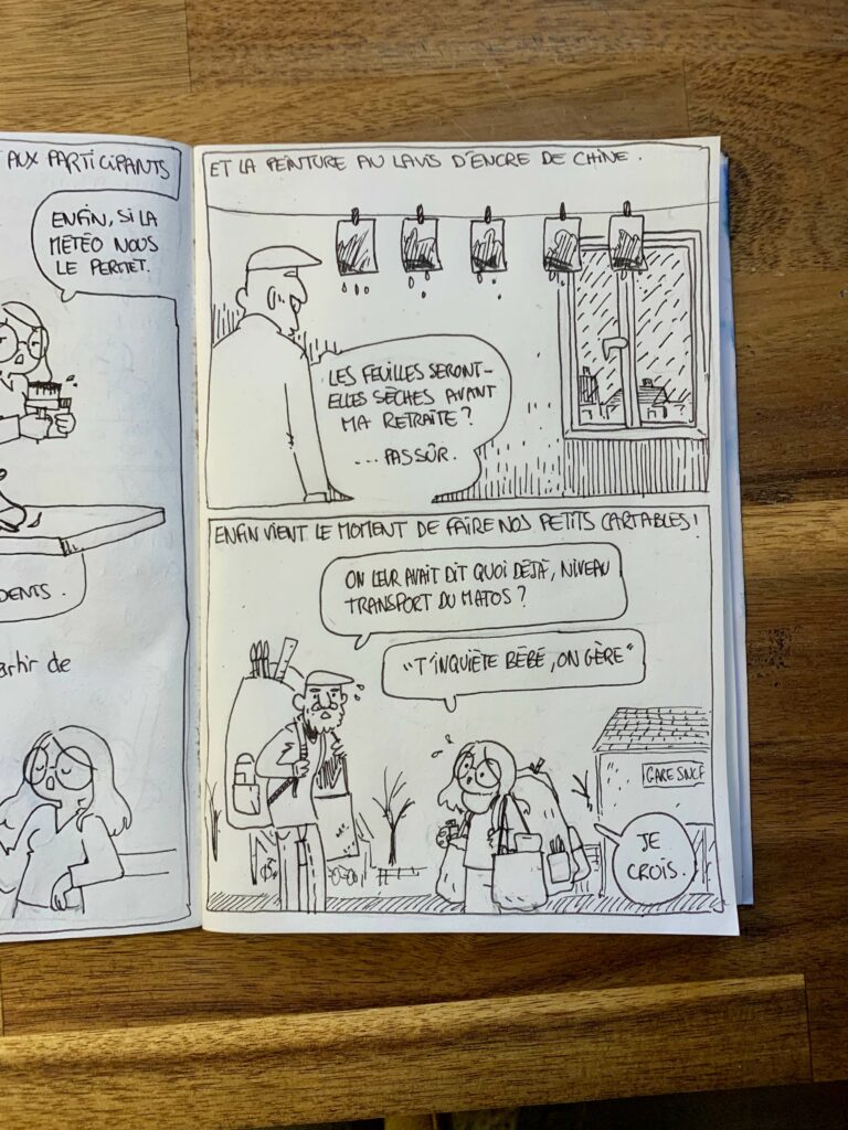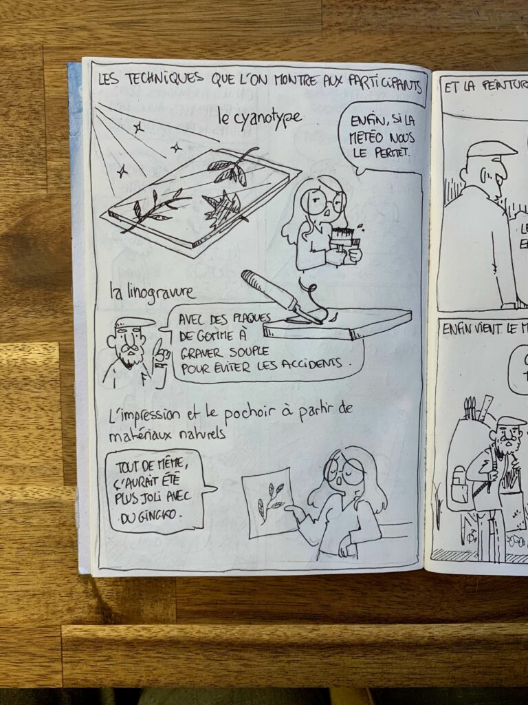 Résidence Résidence artistique – Journal de bord 2 13 novembre 2025 Strip précédent La suite du carnet de résidence ! Aujourd’hui on parle des techniques qu’on montre et utilise avec les participants, et aussi des aléas climatiques !