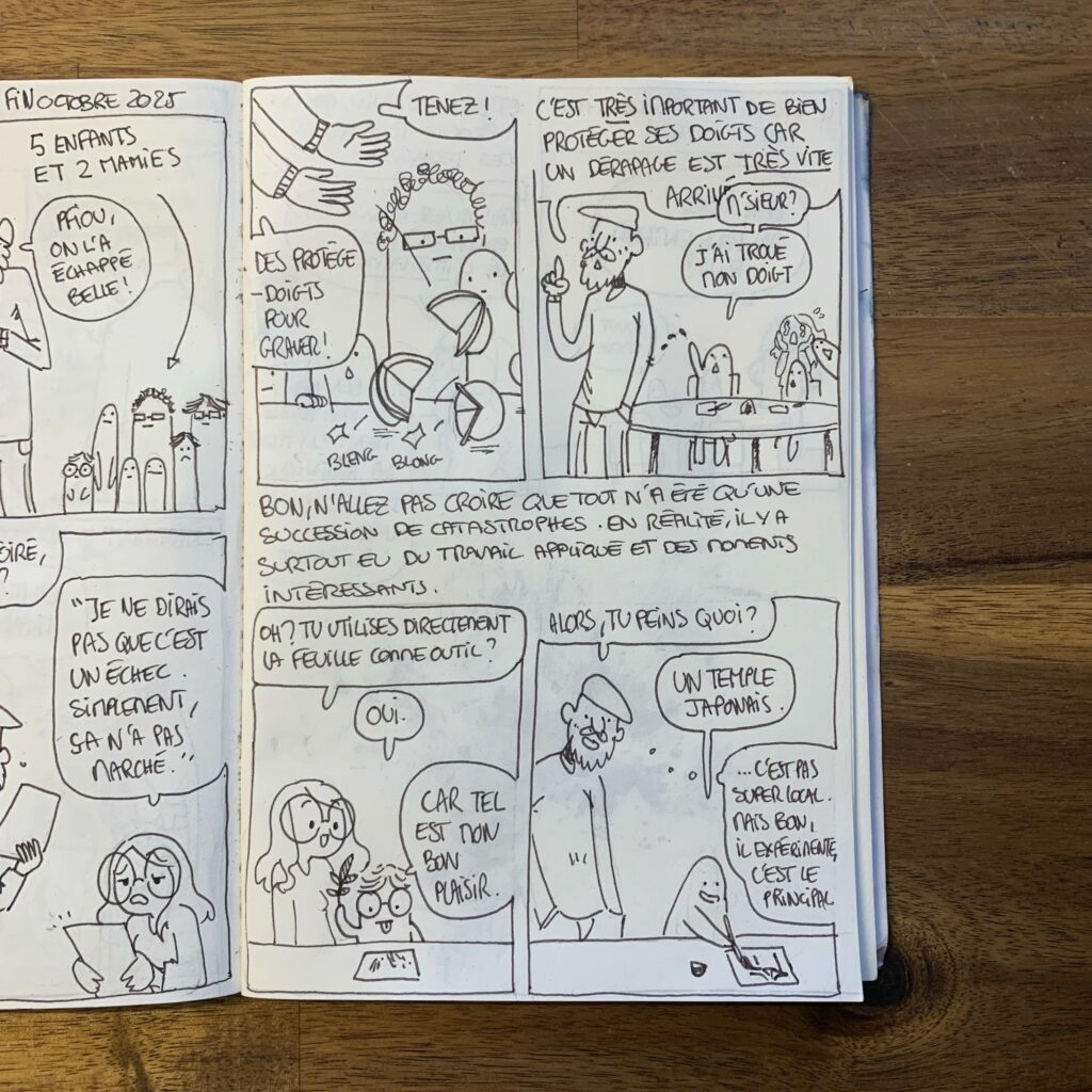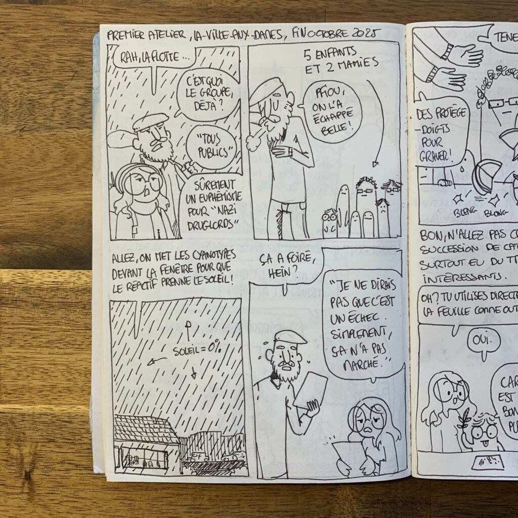 Résidence Résidence artistique – Journal de bord 3 24 novembre 2025 Strip précédent Un petit retour sur le premier atelier, qui s’est déroulé dans les derniers jours d’octobre et qui s’est très bien passé en-dehors de cette sombre histoire de cyanotypes ratés !